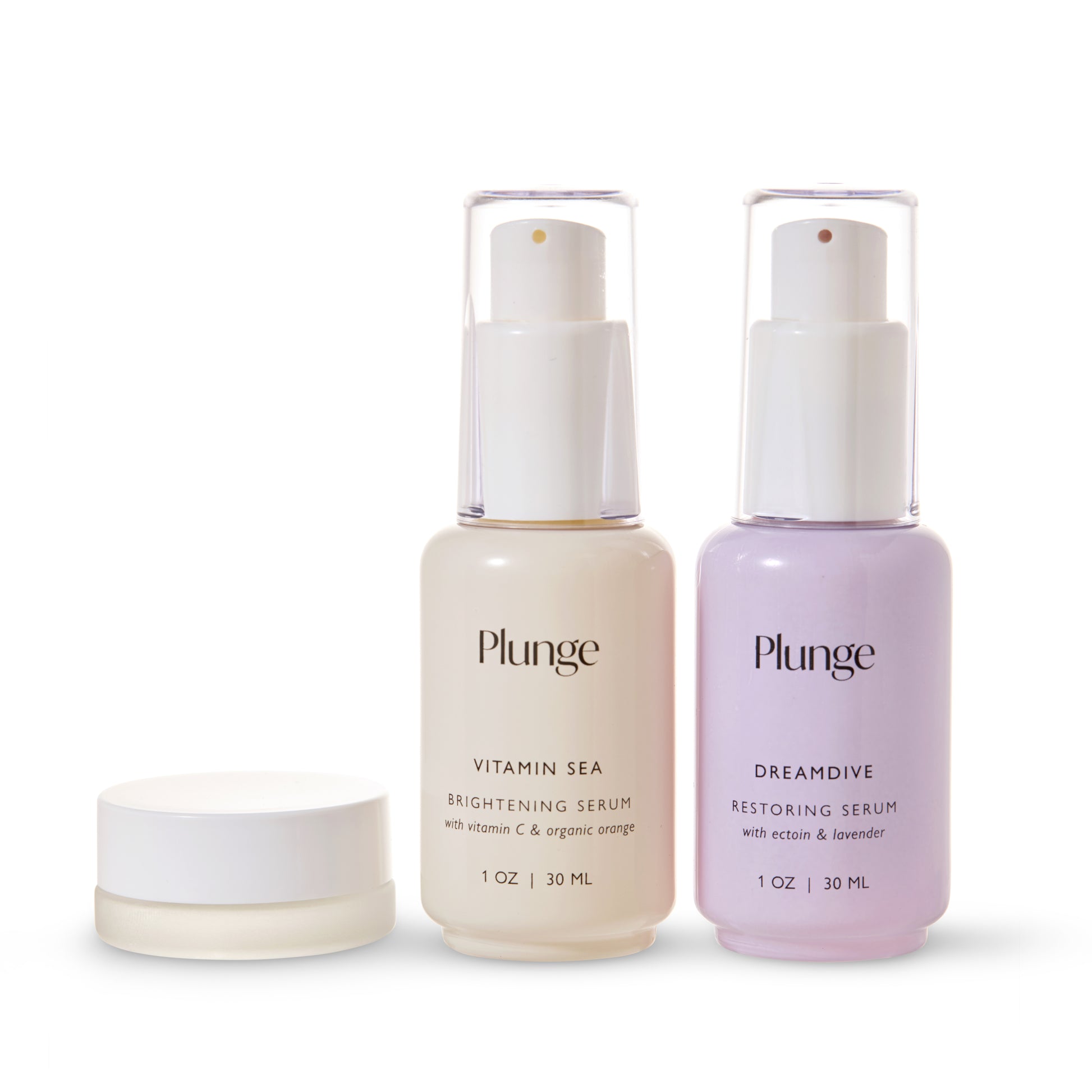 The ultimate Plunge ritual: a three-piece system designed for complete care. Brighten with Vitamin Sea by day, smooth and soothe with DreamDive by night, and refresh the delicate eye area anytime with Ocean Your Eyes. This bundle covers your essentials in one routine.
