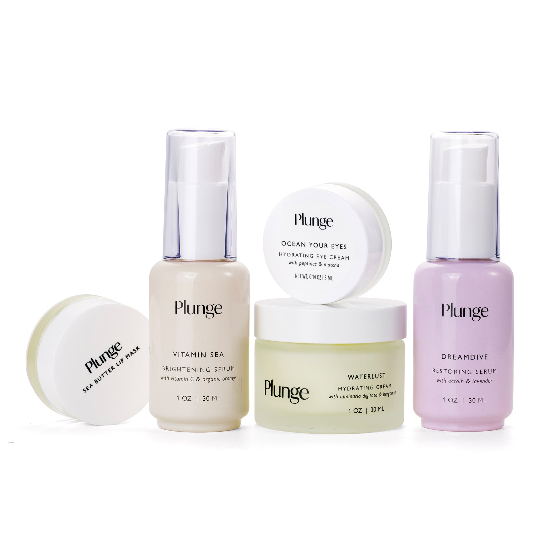 The ultimate Plunge ritual: a five-piece system designed for complete care. Brighten with Vitamin Sea by day, smooth and soothe with DreamDive by night, and refresh the delicate eye area anytime with Ocean Your Eyes. This bundle covers your essentials in one routine.